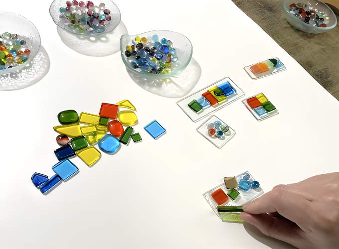 様々な色と形のガラスを接着させてオリジナルのガラス指輪やミラーを作ります。