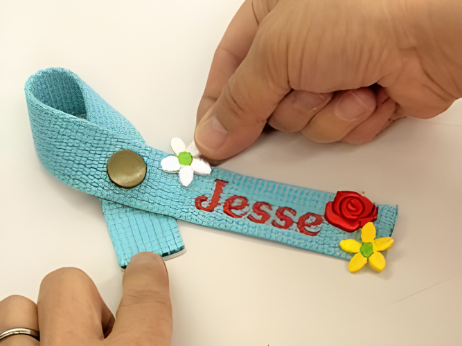 ポーチスタンドとネームタグに推しの名前など好きな文字(アルファベット・ハングル文字・数字)を刻印して、オリジナルのグッズを作ります。ポーチスタンドは簡単な工具を使って、板の状態からスタンドの形に曲げて仕上げます。