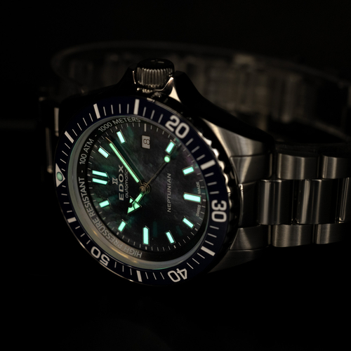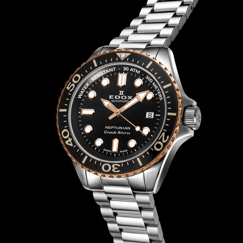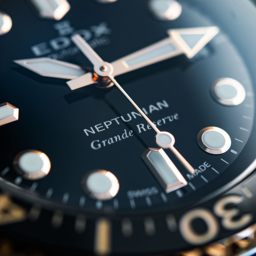 一世紀を超える時計製造の歴史を持つエドックスは、世界初の特許を取得した防水機構を開発するなど、防水時計の発展に貢献し、海を舞台に活躍する人々を支えてきました。ローマ神話における海の神・ネプチューンにインスピレーションを受けて誕生したネプチュニアンは、タフネスと実用性を追求したダイバーズウォッチコレクションです。