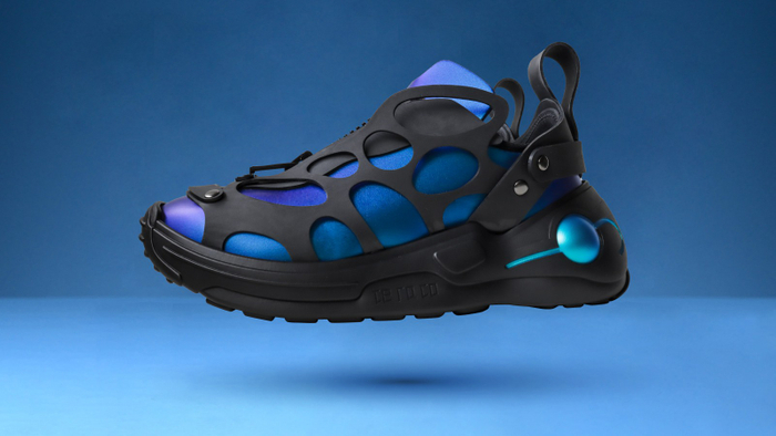磁力で宙に浮かぶ靴は、子どもから大人まで誰もが抱いた空を飛びたいという夢を表現した一足。