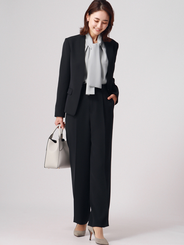 ジャケットはVカラーにすることでスッキリとした胸元を演出。スカートはやや長め丈の巻きスカート風にすることで上品な印象となります。パンツはテーパードとタック入りのセミワイドシルエットを用意。ワンピースは袖のフリルと胸元のパールチャームが華やかな印象にしてくれます。ペプラムブラウスは裾がふわっと広がっているので、ジャケットレスでも着映えします。