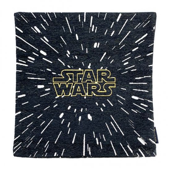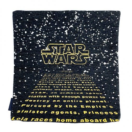まず最初にご紹介するのは、タイトルロゴが描かれたクッションカバーです。裏面にはタイトル映像が全面に描かれており、スターウォーズファンにはたまらないデザイン。