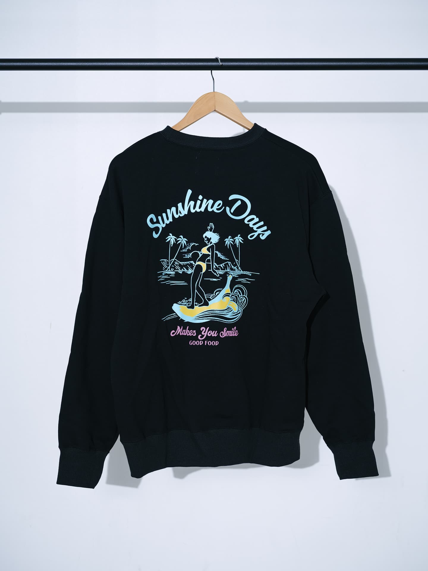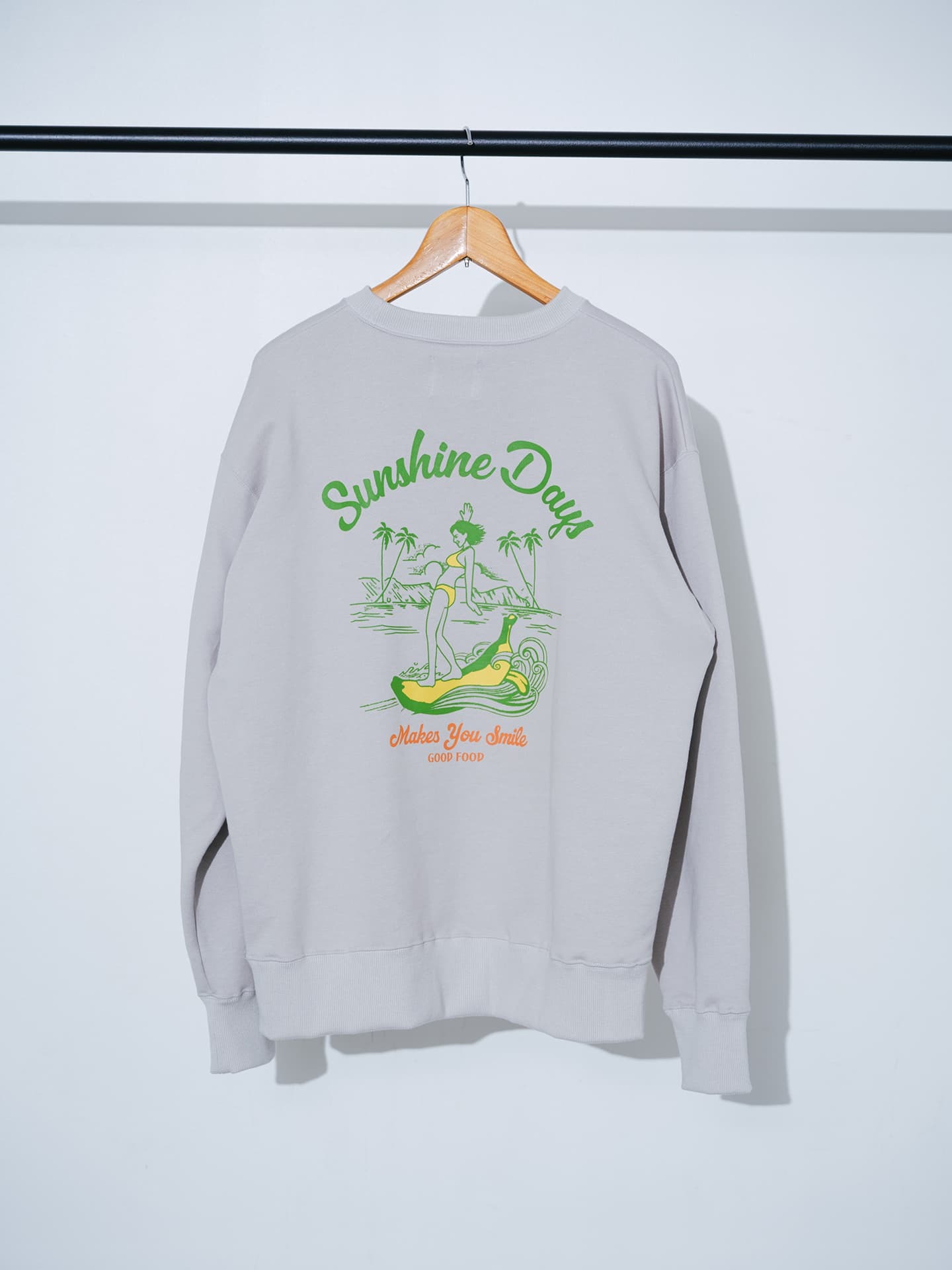 「SunshineDays」の世界観をそのまま包み込むような着心地で表現。グレーとブラックの2色展開で、太陽・海・バナナサーフボードをモチーフにしたバックプリントが、リラックス感と前向きなムードを演出します。家で過ごす時間にも、外に出る日にも、背中のメッセージが気持ちを整えてくれる、そんな1着です。