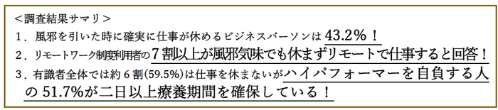 リモートワーカーの7割以上が風邪気味でも 休まずリモートで仕事をすると回答! ハイパフォーマーほど風邪の療養期間が長いと判明!