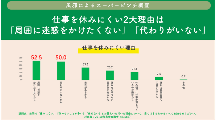 第二弾となる今回は、ビジネスパーソンが風邪を引いた時に、どの程度の方が実際に休みを取得できているのかを調査で明らかにしました。結果からは、半数以上のビジネスパーソンが“休みにくい”と感じており、“周りに迷惑をかけてしまうのでは?”や“代わりがいない”などの理由から休みを取得しにくい状況が垣間見えました。