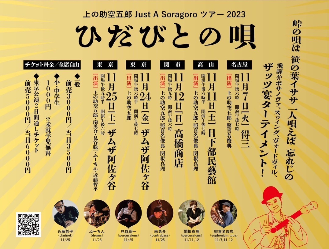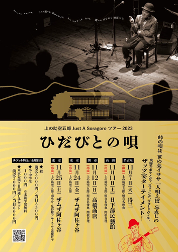 上の助空五郎 Just A Soragoro ツアー2023 「ひだびとの唄」が2023年11月7日(火)より名古屋・高山・関市・東京の4会場にて開催されます。