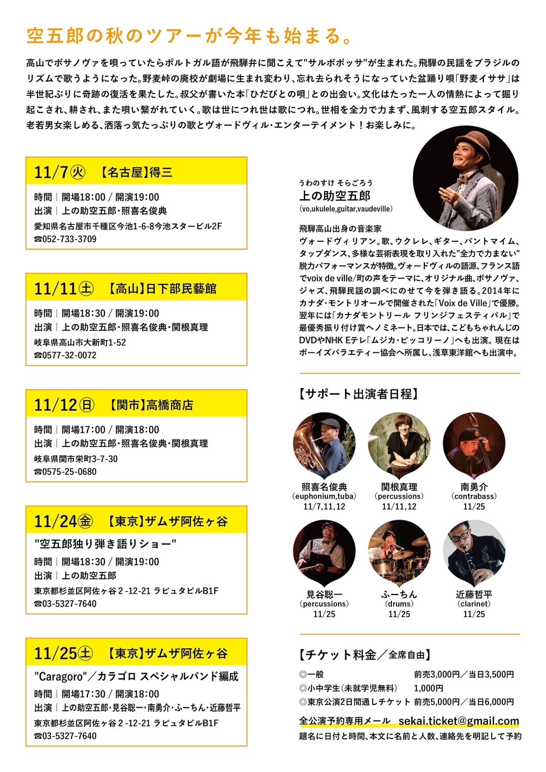 岐阜県 飛騨高山出身の音楽家、ヴォードヴィリアン「上の助空五郎」。秋のツアーが今年も開催!