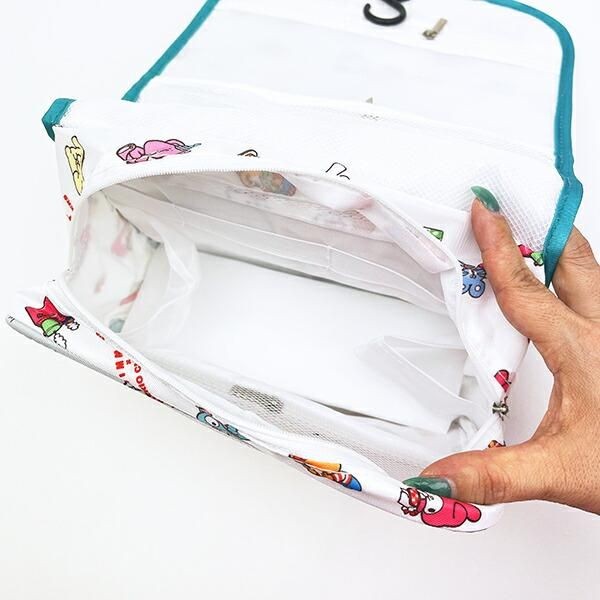 背面ポケットに加えて、内側にもたくさんのポケットが搭載されています。コンパクトなのにたっぷりわけて収納できます。中身が見やすく整理しやすいです。また、吊り下げフックつきなので外出先でも便利にお使いいただけますよ。