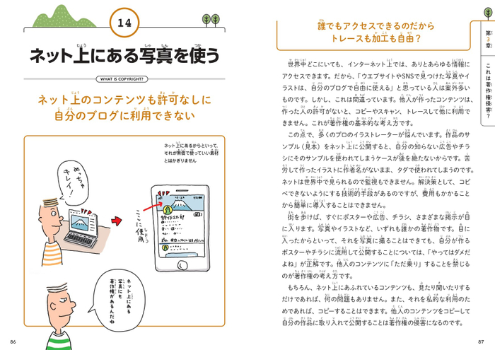 多くの人は著作権について基本的な知識を持っていますが、細かなルールについては知らないことが多いものです。本書では、著作権の知識が自分の作ったコンテンツを守るだけでなく、他人のコンテンツを尊重するためにも重要であることを解説します。親子で一緒に、著作権の基本ルールを学びましょう。