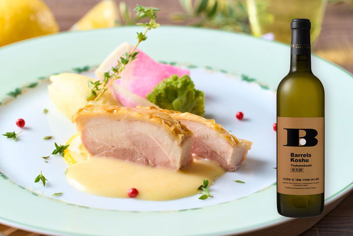右)まろやかな口あたりのリッチな味わいが特徴の「甲州塚ノ越バレルズ」は、さっぱりとしたなかにもコクのある味わいの「信玄どりのロースト ハーブとレモンのバターソース」と一緒にお楽しみください。
