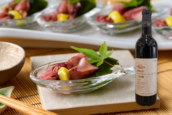 右)豊かな果実味と奥行きのある味わいの「マスカットベーリーA 上屋敷」は、ホタルイカの旨みを引き立て、酢味噌の甘みとのバランスもぴったりのワインです。