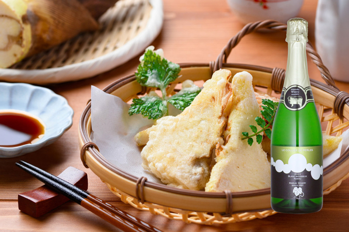 左)柑橘系の香りが特徴で、しっかりした飲みごたえのある甲州スパークリングワイン「コリエドゥペルルブランムスー」は、カラッと揚がった熱々の天ぷらと合わせてどうぞ。