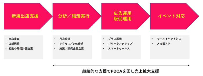 一方、Qoo10の運営においては、ターゲット層に合わせた訴求方法の考案や、各種セールやイベント、プロモーション枠の活用など、Qoo10独自の販促施策の実行が必要となります。他の国内ECモールとは異なるQoo10の運営ノウハウを、限られた社内リソースのなか自社で構築するにはハードルが高いという側面もあります。