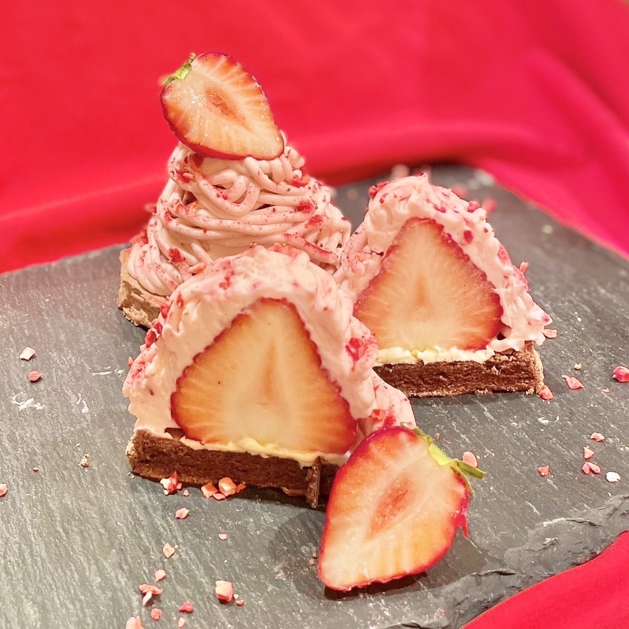いちごの生産量日本一を誇る栃木県「美土里農園」の大きないちごを丸々一粒入れたモンブランです。土台には、軽くてふんわりとした食感の〈ビスキュイ・マカロン・ショコラ〉を使用し、薄くダークショコラをコーティングしています。クリームはもちろん、ガナッシュモンテも苺で仕上げた商品です。