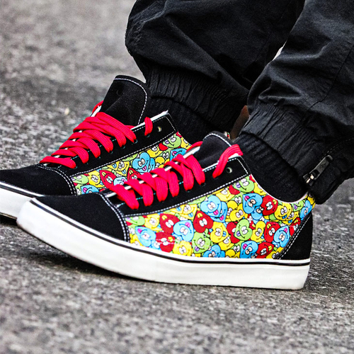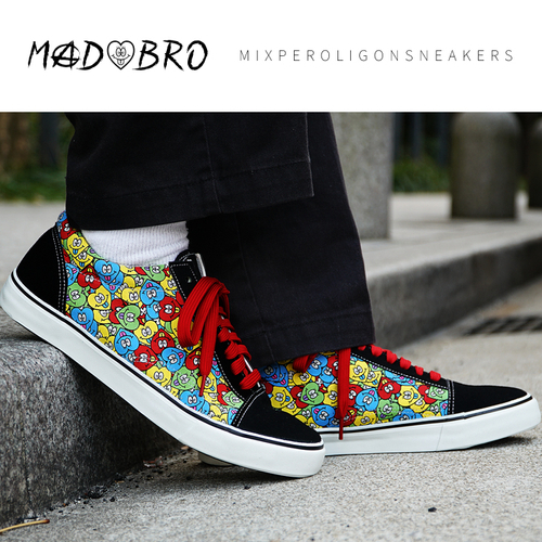 デイリーに使えるシンプルなブラックスニーカーをベースに、MADBROの公式キャラクター『ペロリゴン』をカラフルに敷き詰めた、存在感抜群のアイテムです。