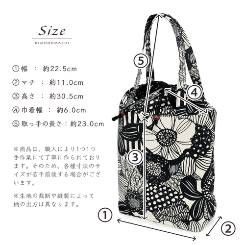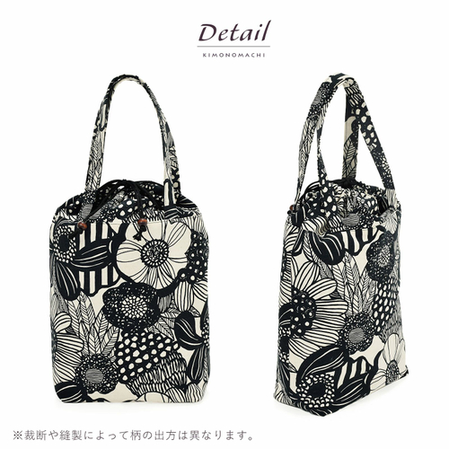 トートバッグの上部は巾着になっているので、中の荷物が見えてしまう心配もなく、防犯面も安心です。生地は、綿麻混の素朴な風合いが魅力のフラワープリント生地。汚れてもご家庭で気軽にお洗濯いただけます。ちょっとしたお出掛けや習い事用のレッスンバッグなど、様々な場面で重宝します。