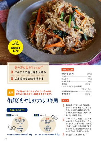 これらを活用すれば、「これ本当に減塩料理?」といわれるような減塩料理が作れます。これらのテクニックを使い、男性が好みそうな定番料理を減塩料理に変身させたレシピが一冊にまとめた本が『うまい! 減塩めし』です。「こってり、しっかり、がっつり」味が好きで、減塩がなかなか実現しないとお悩みに人は、ぜひおすすめです!