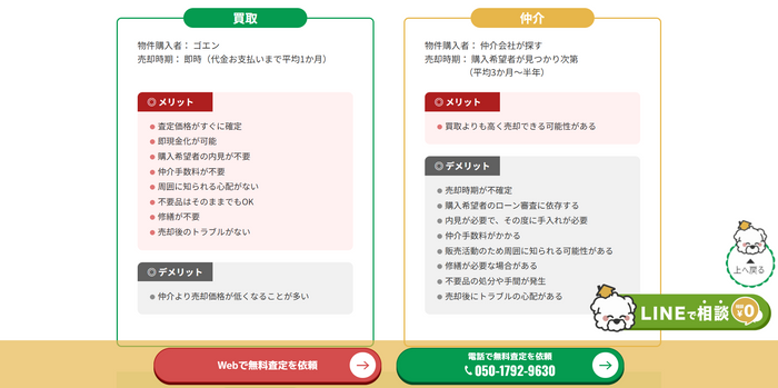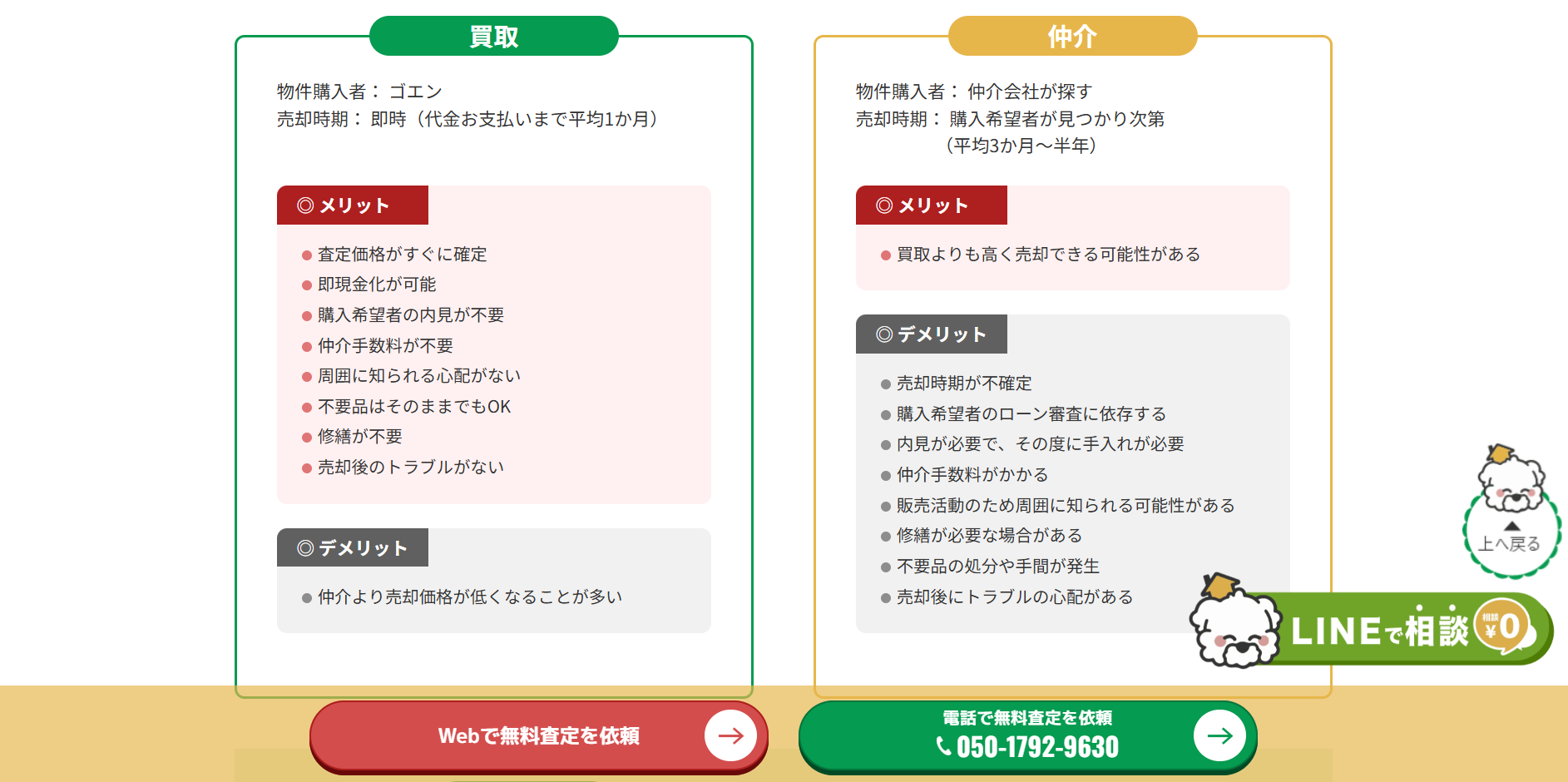 ゴエンの強みである「直接買取」ですが、不動産売買でよく聞く「仲介」との違いを完全に理解している方は少ないのではないでしょうか。ゴエンでは、双方のメリット・デメリットを提示することで、その違いを認識していただき、そのうえで直接買取の強みを知ってもらえるように工夫しております。
