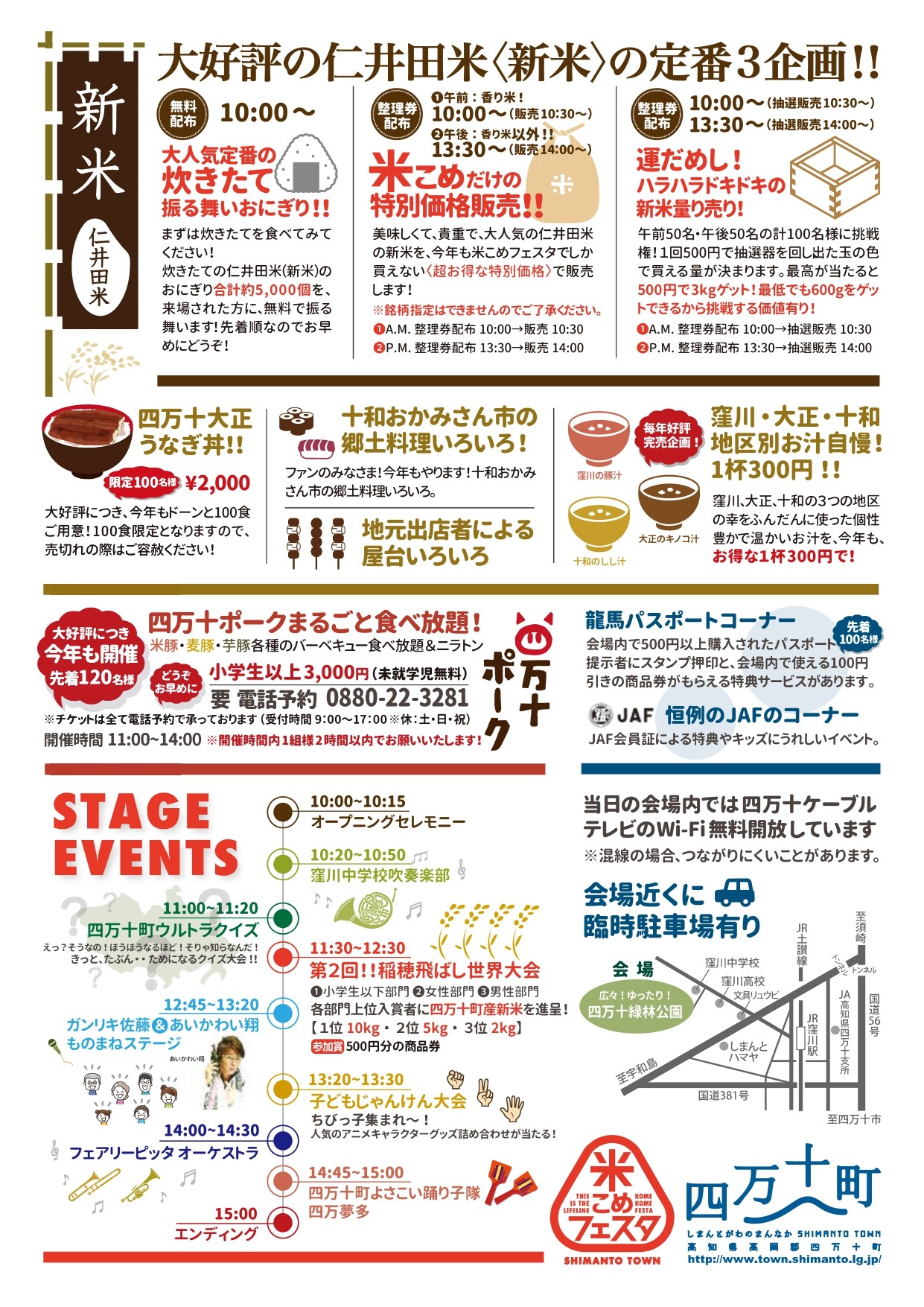 またステージイベントもありますので、11月2日(日)は芝生が広がる四万十緑林公園で食べて・買って・見て「米こめフェスタ」をお楽しみください!