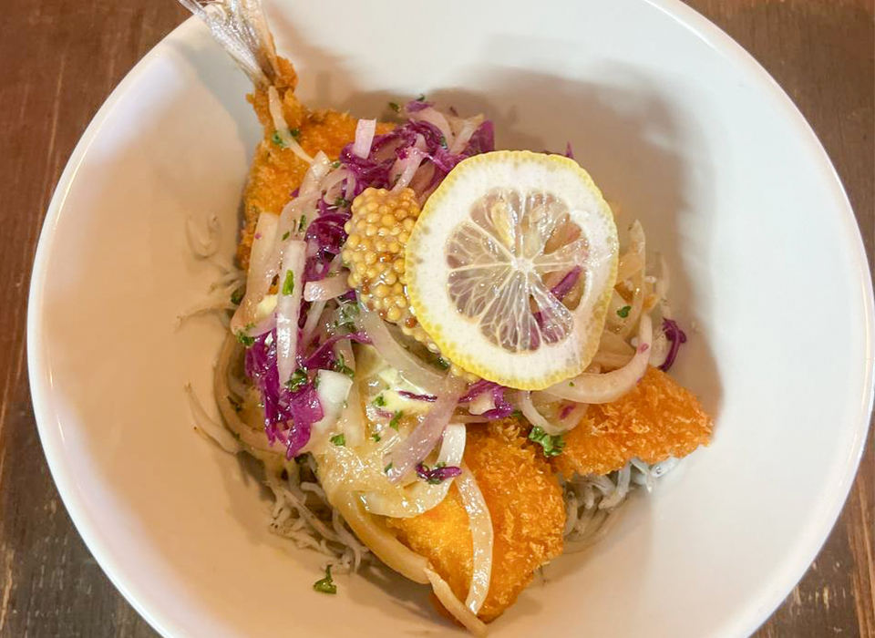「アジフライと新玉ねぎサラダをのせた釜揚げしらす丼」