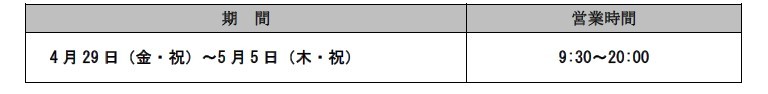 【実施期間】 4月30日(土)、5月1日(日)、5月3日(火・祝)~5日(木・祝)の5日間