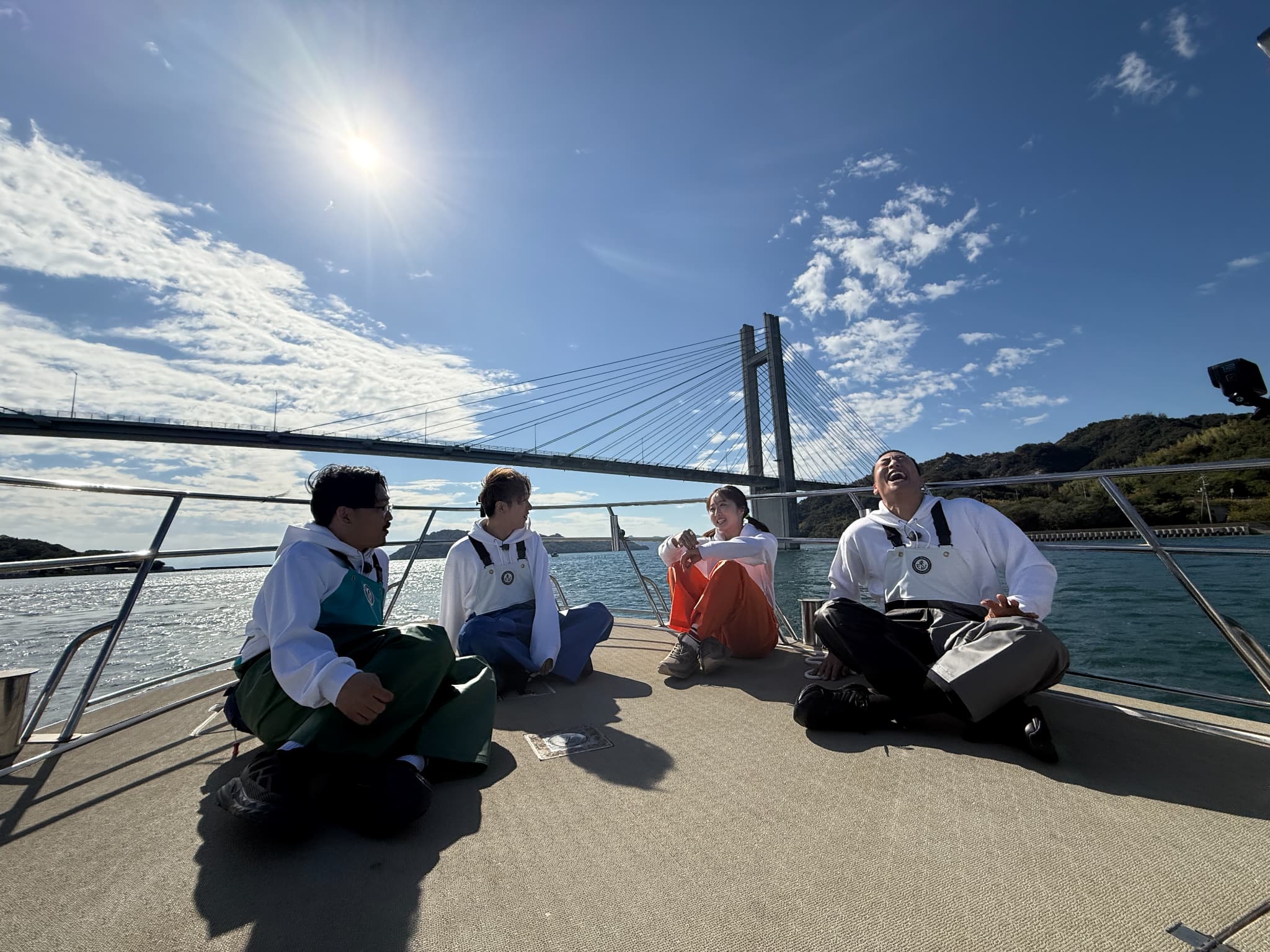 瀬戸内海を船で移動する4人(左から伊藤、村上、本田、関口)