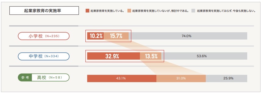 しかし、経済産業省の調査(*1)によると、高校の約57%が起業家教育を実施できていないのが現状。中高生・社会の両方にとって、起業家教育の推進は優先事項だと言えます。