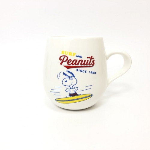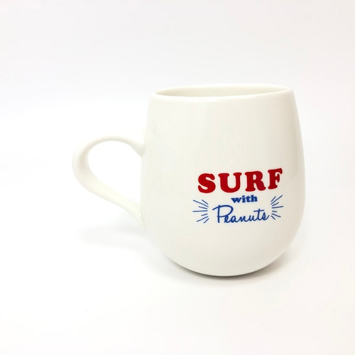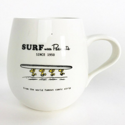 サーフシリーズのラウンドマグです。サーフィンをするスヌーピーが、気持ち良さげです。ロゴもアメリカンチック♪サイズは直径7.5×底直径4.5×10㎝です。使いやすいサイズな上に、かわいいフォルムなんです。
