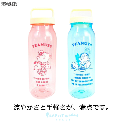 水分補給が必須の季節がっやってきましたね。数ある水筒の中から、今日はスヌーピーのドリンクボトルをご覧いただきます。クリアな素材で軽くて携帯しやすいボトルです。デザインやカラーも、お気に入りを見つけてくださいね。