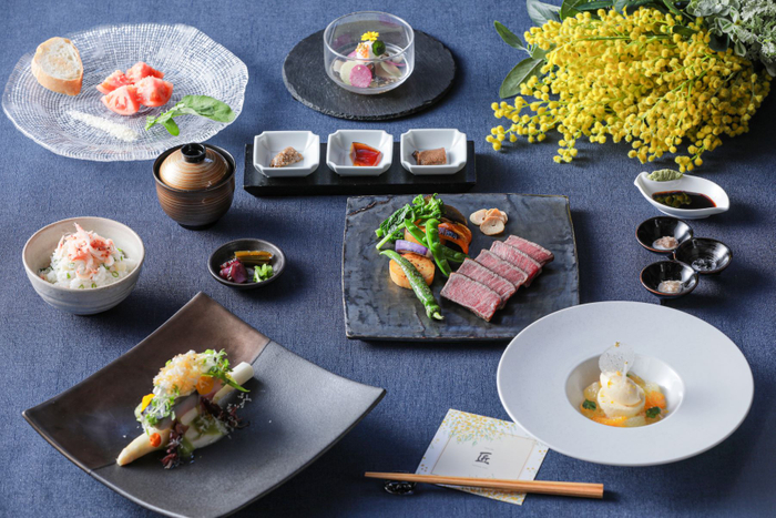 「鉄板焼匠」は暖かい春が来たことを知らせる「ミモザ」がテーマ。春の野菜を織り交ぜた豪華なコース料理に仕上げました。