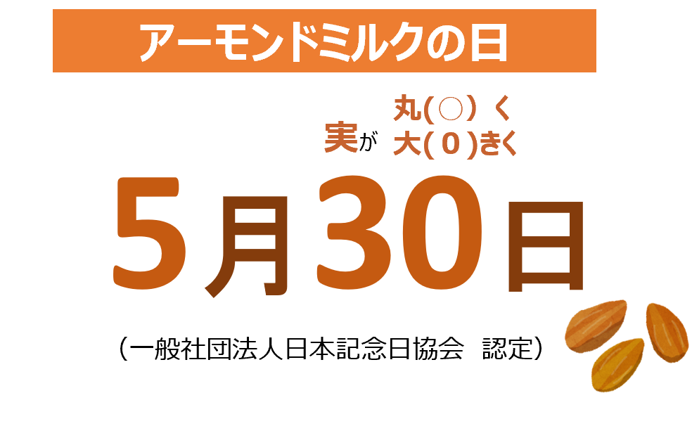 アーモンドの実は5月の下旬ごろになると、丸く・大きくなります。そこで、3を「実」、0を「丸」と「アルファベットのO(オー)」に見立てて「実が丸く・大きく」と表現し、5月30日がアーモンドミルクの日として日本記念日協会に認定されました。