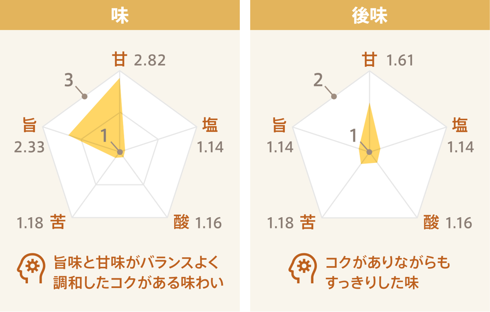 アーモンドミルク研究会では、アーモンドミルクをもっと味わって楽しんでもらうべくAI味覚センサーを用いて「甘味」「塩味」「酸味」「苦味」「旨味」の基本五味と香りを数値化しました。