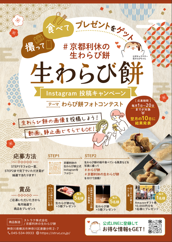 京都利休では、SNSを活用した新たな取り組みとして「#利休の生わらび餅チャレンジ」を実施中です。このキャンペーンでは、生わらび餅を楽しむ様子や美しい盛り付けの写真を投稿していただくと、抽選で季節限定商品や特別セットなどの豪華商品が当たる特典をご用意しています。開始からわずか数週間で、人気インフルエンサーから和菓子愛好家、スイーツ好きの一般の方まで、幅広い層から数多くの魅力的な投稿が寄せられ、SNS上で大きな盛り上がりを見せています。特に、生わらび餅の艶やかな質感や、黒蜜やきな粉をかける瞬間を捉えた写真や動画は、多くのユーザーの心を掴んでいます。