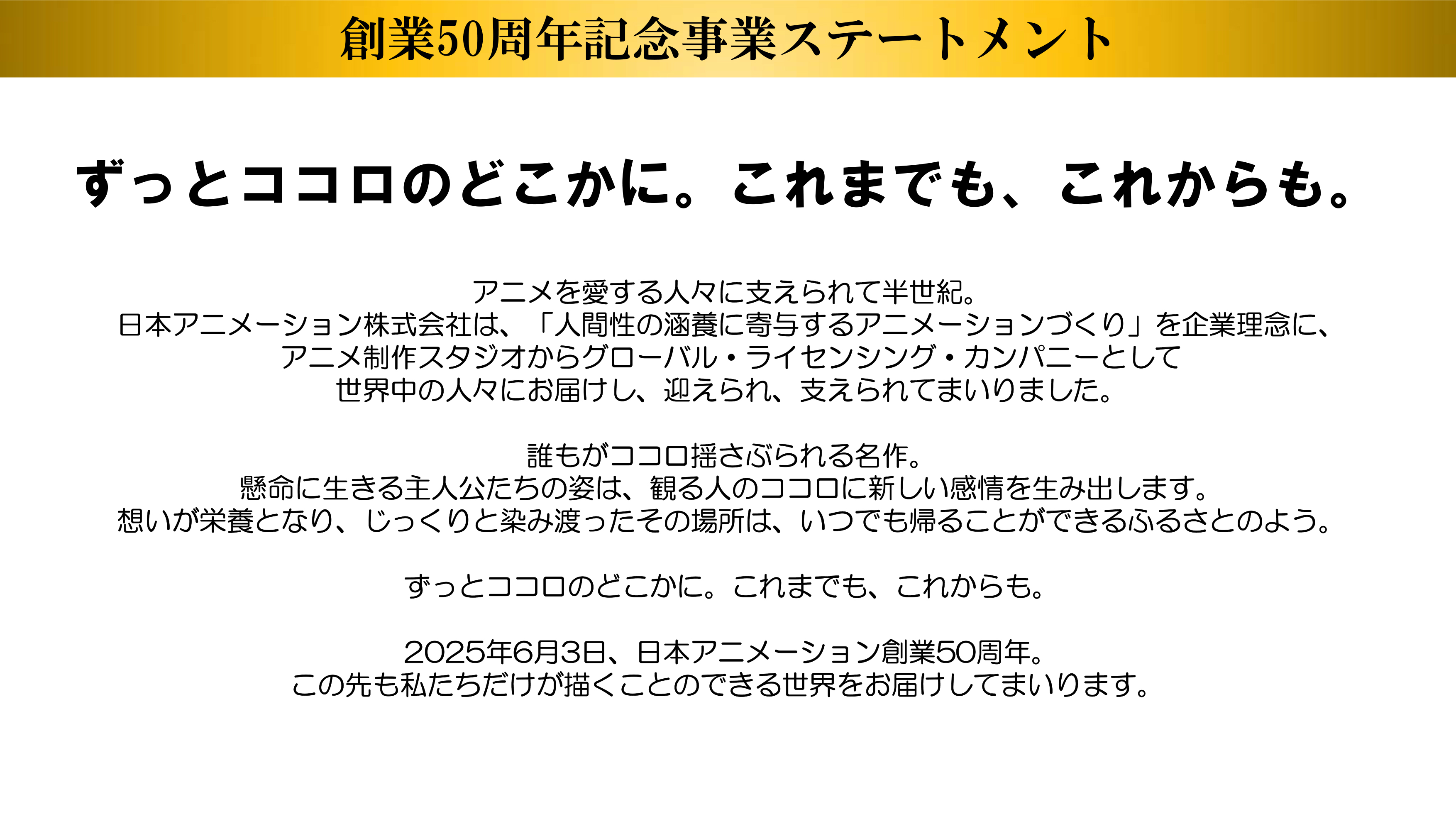 日本アニメーション株式会社(本社:東京都中央区、代表取締役社長:石川和子)は、来る2025年6月3日(火)の創業50周年記念日を迎えるにあたり、本日より約2年間にわたって関連企画やリニューアル事業を順次推進してまいります。つきましては、創業50周年記念ロゴおよび推進期間での当社姿勢をステートメントにて公表いたします。今後はキービジュアル、50周年記念サイトなどを順次公開すると共に、この時期にこそお届けしたい作品やサービスの提供に注力してまいります。