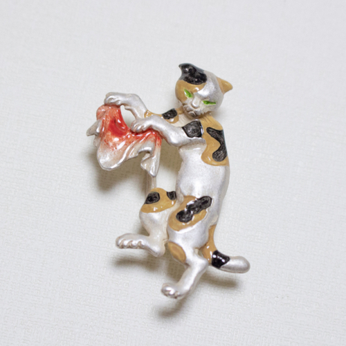 東海道五十三次を言葉遊びで猫のしぐさにたとえた歌川国芳の作品「其まま地口猫飼好五十三疋」より、亀山の猫を帯留めにしました。