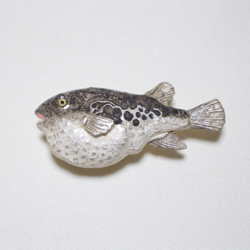 まるまるした姿が愛らしいフグの帯留め。江戸時代に活躍した日本画家、伊藤若冲の「群魚図≪鯛≫」で描かれているフグがモデルになっています。
