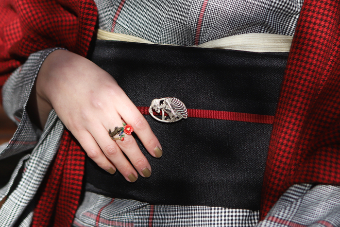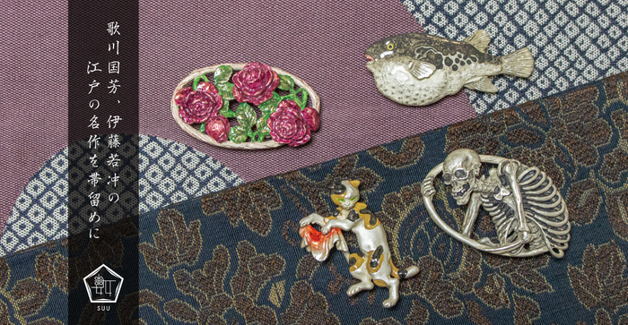 江戸時代末期に奇抜な浮世絵作品を数多く残した歌川国芳の作品をモチーフにした帯留め2種類と、伊藤若冲の日本画をモチーフにしたフグの帯留め、オリジナルデザインのバラの帯留めなど全4型が発売となります。