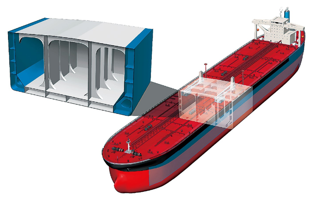 日本製鉄、海上・港湾・航空技術研究所、今治造船は船舶の衝突安全性の一層の向上を目指して、厚鋼板の延性の向上を発案しました(図1)。本発明は、船舶からの大規模油流出防止等の海洋環境保全を目的として、研究されたものであります。最先端の数値シミュレーションと大型部分構造実験等を駆使して、具体的に、従来規則値の1.5倍以上の鋼材伸びを提案し、その上で日本製鉄は延性向上のための冶金原理を確立し、厚鋼板製造条件の高度化、量産化を実現しました。