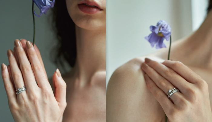 《カオリヤマモト》のリングはファッションリングとのコーディネートにも邪魔をせず、日常のスタイリングに自然と調和します。普段使いとしても活躍するため、結婚後も長く愛用いただけるアイテムを中心に品揃えしています。