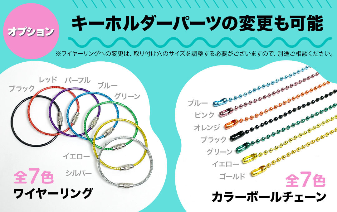 オリジナル アクリルキーホルダー(アクキー)のキーホルダーパーツは、デフォルトで選択できる「ボールチェーン(シルバー)」「ナスカン」「押し二重カン」の他にも、オプションで「カラーボールチェーン」や「ワイヤーリング」などに変更することも可能です。