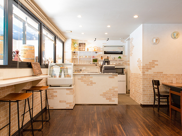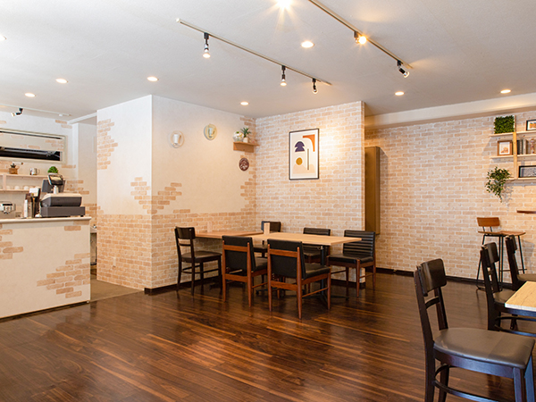 1Fカフェ店舗内はウッドを基調とした、落ち着いた雰囲気。座席は壁付けソファー席・テーブル席・オープンテラス席を合わせた、全22席を配置。大通りに面したオープンテラス席は南向きで自然光が望めます。