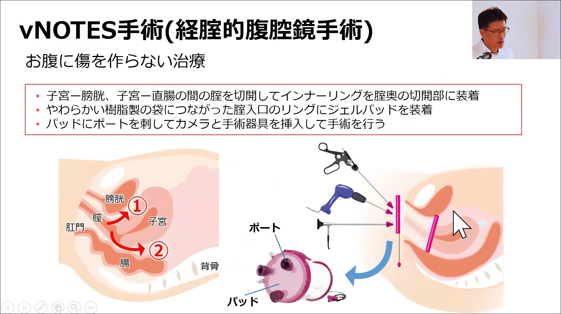具体的には、お腹に傷ができない手術方法としてvNOTES(経腟的腹腔鏡手術)や、過多月経・不正出血に対するMEA(マイクロ波子宮内膜アブレーション)などの治療法の、特徴や適応について、実際の症例動画を交えながら解説しました。