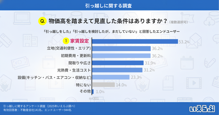 「引っ越しをした」「引っ越しを検討したが、まだしていない」と回答したエンドユーザーに「物価高を踏まえて見直した条件はありますか?」と質問したところ、「家賃設定」が53.2%と最も多く、次いで「立地(交通利便性・エリア)」および「初期費用」がともに36.2%という結果となりました。