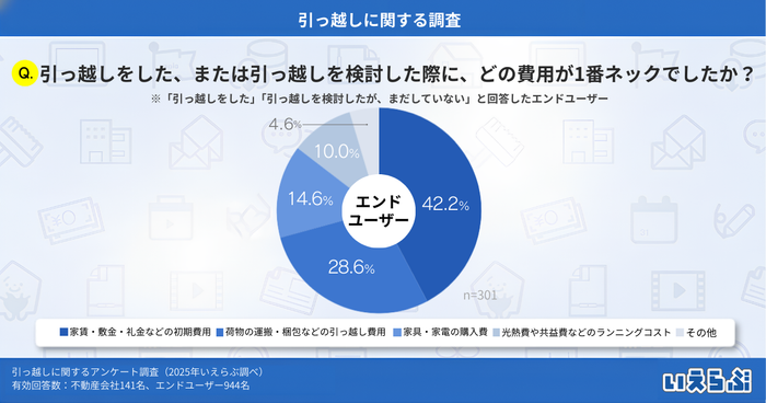 エンドユーザーに「引っ越しをした、または引っ越しを検討した際に、どの費用が最もネックでしたか?」と質問したところ、「家賃・敷金・礼金などの初期費用」が42.2%と最も多く、次いで「荷物の運搬・梱包などの引っ越し費用」(28.6%)、「家具・家電の購入費」(14.6%)、「光熱費や共益費などのランニングコスト」(10.0%)、「その他」(4.6%)という結果となりました。