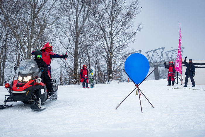 当スキー場では、オープンを記念しサムライに扮したスタッフがゲストとともに、刀でテープカットを行い、コースを一斉に滑り降りる出陣式を2018-19シーズンより実施しています。2020-21シーズンの出陣式は、スタッフとゲスト合わせて約60名が参加。出陣式の途中では、スタッフがスノーモービルに乗りながら、弓矢で的を狙う「スノーモービルやぶさめ」を披露。今シーズンの降雪と、コロナウイルス退散の願いを込めて矢を放ち、見事、的を打ち抜きました。その後、サムライの掛け声とホラ貝の音色を合図に、刀でしめ縄のテープカットを行い、ゲストとサムライ達はアルツ磐梯での初滑りを楽しみました。