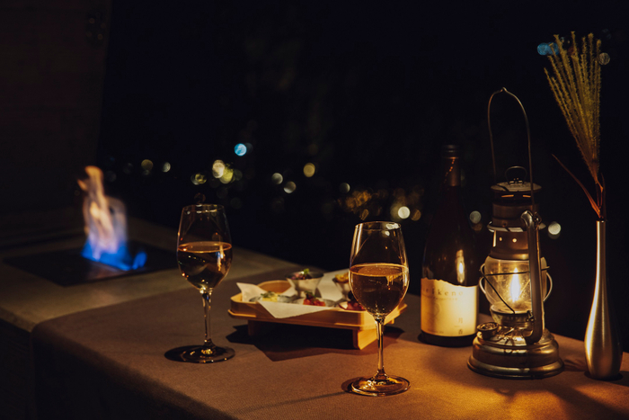 日本初のグランピングリゾート「星のや富士」では、 2021年9月14日~11月17日までの半月~満月の夜限定で、絶景を眺めながら、秋の夜長を優雅に過ごす「グラマラス月光ディナー」を提供します。優美な月光と河口湖の夜景を望むキャビンのテラスで味わう、秋の味覚をふんだんに使ったディナーです。食事には月にまつわるワインをマリアージュし、ワインと料理の豊かな風味を堪能します。都会では見えにくい月光や夜空を眺めながら、秋の夜長を優雅に過ごせます。