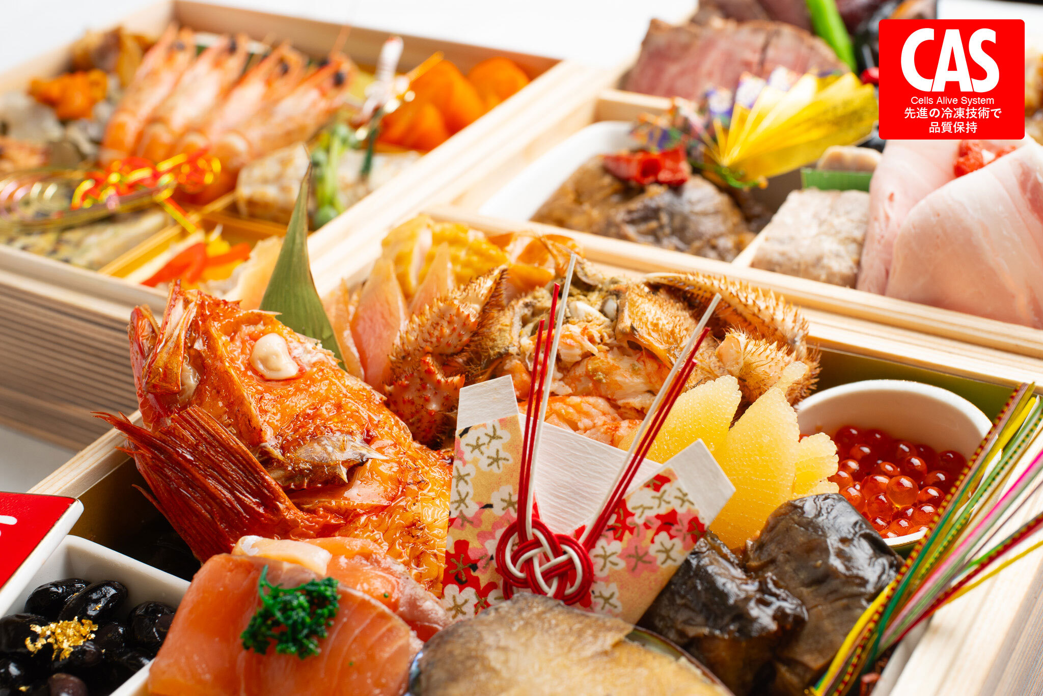 岩手県産の天然食材と高級食材をふんだんに使用した特製三段重です。食品添加物を極力使わずに、昔ながらの手造りの美味しさにこだわっています。容器には、杉板の表面を焼いて炭化させる「焼杉」の技術を用いた、希少な秋田杉の重箱を使用。食べ終わってからも使いまわしのできる、サステナブルで利便性の高いオリジナル木箱です。おいしさを保つ特殊冷凍マシン「CAS」(※)を使用しているため、ご家庭の冷蔵庫に入れて解凍するだけで、凍結前のフレッシュな状態が再現(回復解凍)、手間なく簡単に、高品質なおせち料理をお楽しみいただけます。