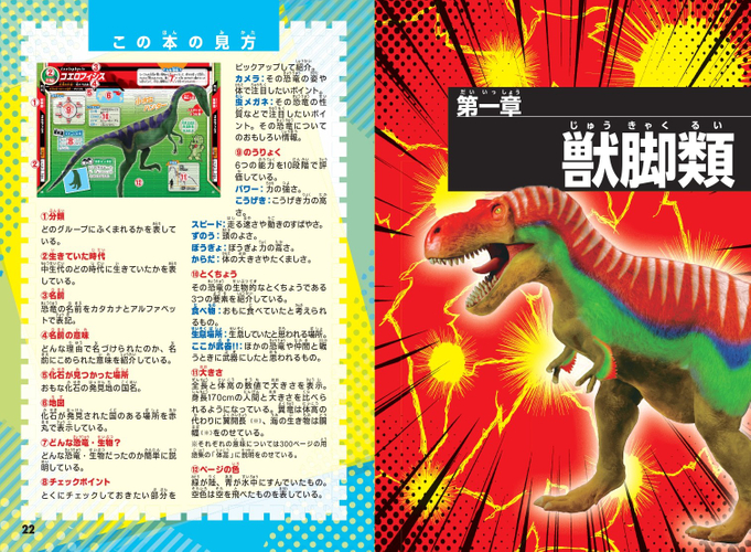 本書では、新種の恐竜などを含め120種をドドンと紹介! 最新研究をイラスト等をまじえながら紹介しています。