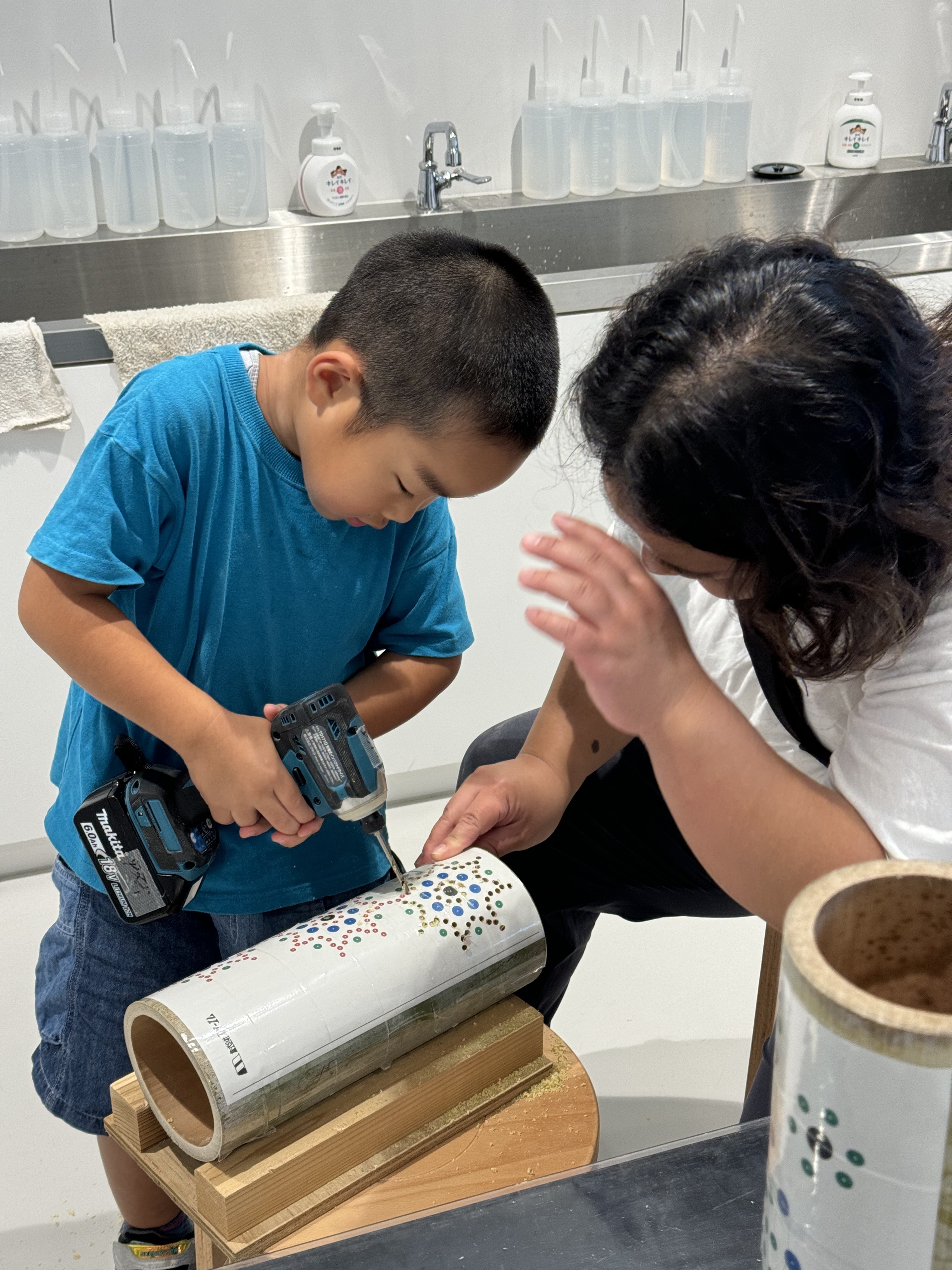 松平郷亭前の特設テントにて、中京大学の学生が講師となり、来場者が自分だけの竹灯籠制作を体験できます。