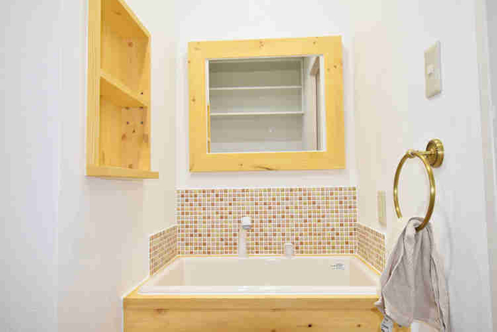 一方当物件においては(一部の部屋のみとはなりますが)『完全オーダーメイド』のナチュラル洗面台を設置しています。こちらは「家具屋さん」にお願いして特別に製作してもらった一点物。当然ですが、市販化されていないので、価格も通常の洗面台の2倍ぐらいと、高額になってしまいますが、ただ使い勝手は抜群にいいです。